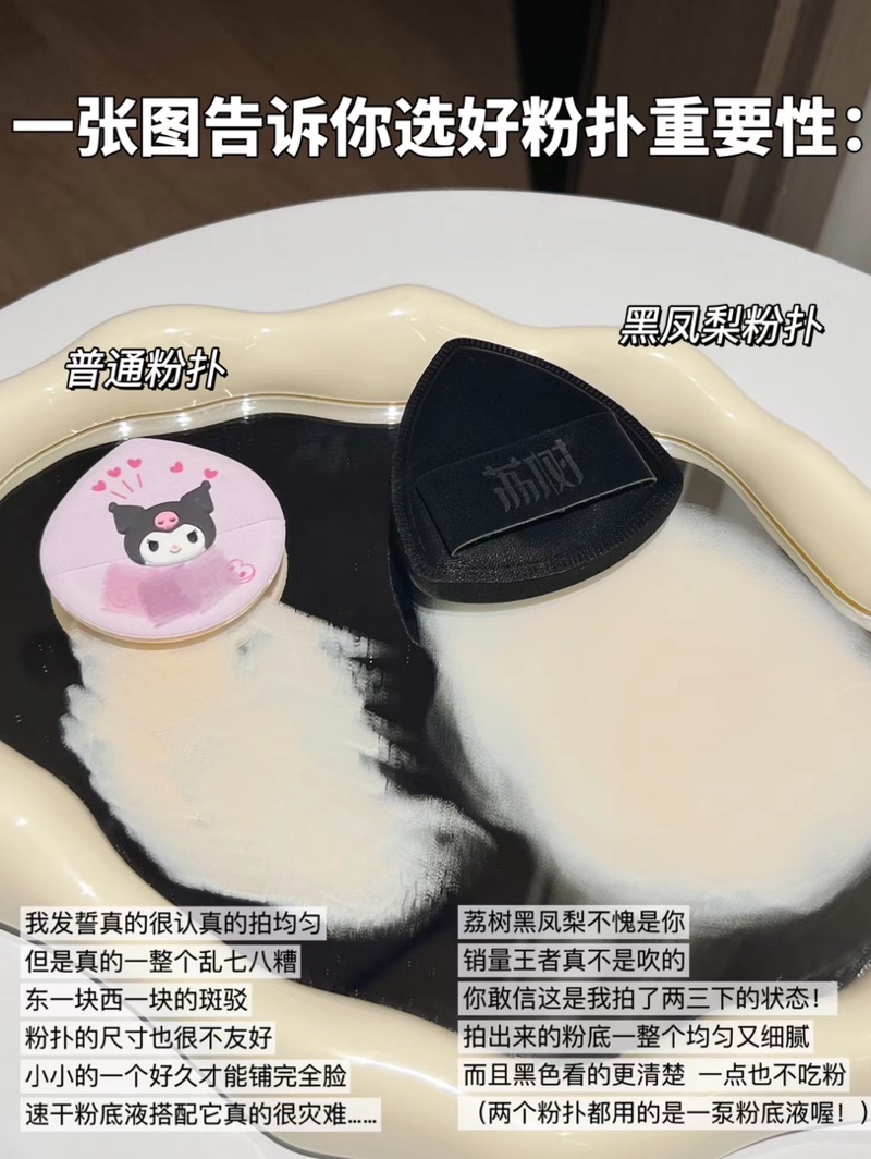 咱就是說好的工具真的能讓化妝事半功倍!荔樹的黑鳳梨底妝cp一刷一拍輕鬆打出瓷實底妝一字粉底刷真的側面薄到不行🥹🥹🩶兩三下輕輕鬆松刷完全臉了 上粉都特別均勻再用黑鳳梨粉撲全臉拍勻這妝感真絕了!粉粉撲也主打一個不吃粉 上臉柔軟好拍手感像一個軟fufu的軟糯麻薯一樣🥞🥞用這一對cp打出來的底妝輕薄服帖還乾淨